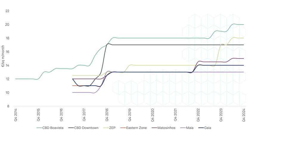 Office rents in Porto have shown a consistent upward trend, with CBD Boavista historically leading in rent prices. CBD Downtown, which previously had the second highest rents, has recently been surpassed by ZEP due to the addition of qualified stock in this zone. Maia, Matosinhos, and Gaia have demonstrated similar trends in rents; however, in the past year, the rents in these three zones have diverged significantly, with Matosinhos presenting the highest rents.